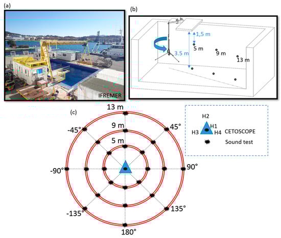 (a) view of the IFREMER (La Seyne/Mer) experimental pool, (b) side representation of the pool experiment protocol, (c) top view of the successive speaker positions.