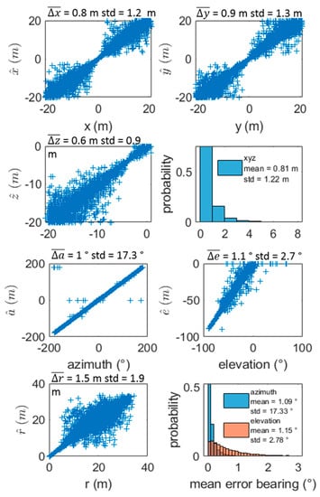 The azimuth point cloud was concentrated around the line with a mean error of 1° (with std = 17.3°) and did not show any dependency with the bearing. A few erratic values resulting from confusions in the sign highly impacted the std, representing less than 0.1% of the cases. These values were removed from the distribution representation for graphical representation reasons. Elevation showed a spreading profile of the error when the elevation was weak, i.e., when the source was near the surface. Mean error was evaluated at 1.1° (std = 2.7°). The distribution of the bearing error regularly decreased for the highest value and was very narrow for azimuthal estimates, as 97% generated an error under 1°. Radius estimates showed a similar dependency on the distance, as revealed with Cartesian representations.