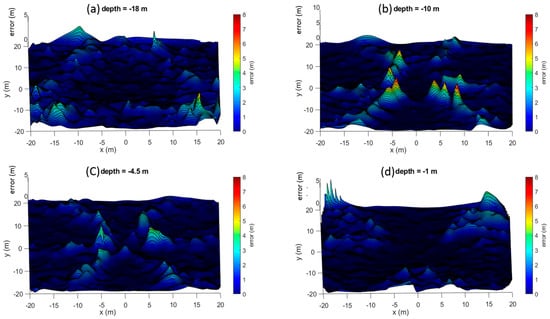 3D representation of the estimated error for different (z) cuts as function of Cartesian coordinates (x,y): (a) z = −18 m, (b) z = −10 m, (c) z = −4.5 m, (d) z = −1 m. CETOSCOPE© virtually placed at 4.5 depth.