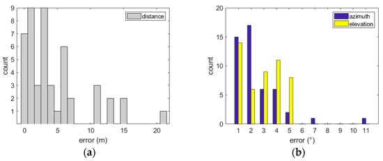 The results and representation were rigorously prepared by human experts. However, higher fluctuations were expected for the pool experiment due to the difference in the number of realizations: 48 versus 10,000 for the simulation. At a global level, Figure 7 presents the histogram of the mean error between the retrieved positions and the true positions. For Cartesian coordinates, in Figure 7a, with a resolution of 0.83 m, the distribution spread out to an error of 21 m. Note that retrieved positions resulting in an error greater than 10 m represent 8/48 cases. Random events in the experimental setup or processing may have deteriorated these results. The mean error value was 2.7 m (std = 2.1 m) without considering the outliers (4.5 m, std = 4.8 m for the raw distribution). A total of 16/48 positions were retrieved with an error value equal to or smaller than 1 m. In Figure 7 b, the distribution of the error over the retrieved angles of arrival azimuth and elevation is given with a resolution of 1°. The mean value is 2.3° (std = 1.8°) for the azimuthal error and 2.5° (std = 1.5°) for the elevation (respectively, 2.3° (std = 1.9°) and 2.8° (std = 1.5°), without outliers’ correction). A total of 38/48 retrieved positions presented an azimuthal error smaller than 3°, and 29/48 retrieved positions presented an elevation error smaller than 3°.
