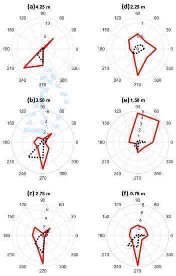 Figure 8 shows a polar representation of the error in the different azimuths for all the measured Z plans, for the pool experiment and for the numerical simulation. These polar plots highlight the directionality of the error. Except for the z = 1.50 m (Figure 8e), results show a relative accordance between the experiment and the simulation by pointing out the bearing of the highest error. Given the considered plan, its direction changes between 225° and 270°.