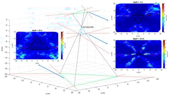 3D cartography of the resulting error showed that the ability to estimate the position was closely linked to the relative position of the source regarding the depth of the device. Some of the high-error areas were located along axes containing a pair of hydrophones. The ambiguity appeared as the algorithm could converge for different possible solutions. A projection of the tetrahedron on the plan (xy) showed that error accumulated close to the projection, see Figure 9. Shadow areas were numerous and close to the device for plan located at the depth of device. However, some high error areas remained unexplained by this principle.