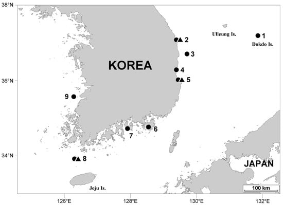 A map showing locations. (1) Dongdo port, Dokdo Is.; (2) Huam Rock, Uljin; (3) Wangdolcho Rock, Uljin; (4) Jangsa beach, Yeongdeok; (5) Haseondae, Pohang; (6) Deokwon beach, Geoje; (7) Wolpo beach, Namhae; (8) Sinyang port, Chuja Is.; (9) Wido beach, Wido Is., Buan (symbols as follows: ● Copidognathus levicostatus n. sp., ▲ Copidognathus vicinus).