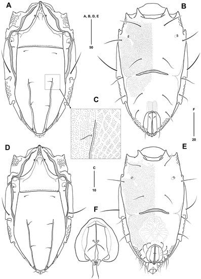 Description of female (holotype). Idiosoma (Figure 2A and Figure 8A,B) 263 µm long (245–274 µm, mean = 261 µm, n = 20), 139 µm wide (125–163 µm, mean = 144 µm, n = 20); length to width ratio about 1.89. All dorsal plates (AD, OC, and PD) well-developed, adjacent to each other, but not fused to each other; dorsal plates covered with punctate pores, without areolae of distinct rosette pores.