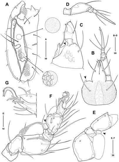 Gnathosoma (Figure 3B,C) 71 μm long (67–73 µm, mean = 70 µm, n = 20), 51 μm wide (49–54 µm, mean = 51 µm, n = 20), consisting of rostrum anteriorly and gnathosomal base posteriorly; small lamellae located at dorsolateral corner of gnathosomal base (indicated by arrowhead in Figure 3B,C); rostrum 36 μm long, half of gnathosoma, narrowing apically and its tip reaching end of P-2; with four pairs of rostral setae: two pairs of short rostral setae (protorostral and deutorostral setae) issuing near tip of rostrum, and two pairs of long maxillary setae (tritorostral and basirostral setae), tritorostral seta on half of rostrum and basirostral one at level of anterior third of gnathosomal base, respectively; gnathosomal base ornamented densely with canaliculi on ventral surface and slightly faint, 5–6 large pores on lateral side. Palp (Figure 3B,D) consisting of four segments, 7, 28, 6, and 40 μm long, respectively; P-1 and P-3 without setae; P-2 with one dorsal bipectinate seta subdistally; P-4 slender and the longest, 1.43 times longer than P-2, with three long proximal and one short distal setae, and its terminal bifurcated. Tectum (Figure 3C) represented by low crista dorsally. Chelicera (Figure 3C) 53 μm long, 11 μm wide, with quadrangular shaped base and movable digit terminally; appendage 17 μm long, dorsal margin with row of minute teeth.