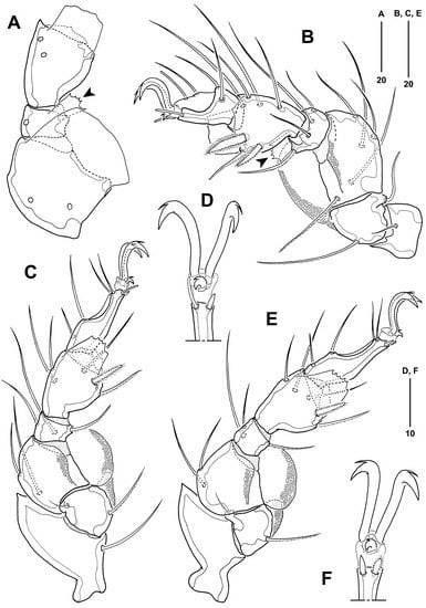 Chaetotaxy of legs (Figure 3F and Figure 4B,C,E) as follows: trochanters 1-1-1-0; basifemora 2-2-2-2; telofemora 5-5-2-2; genua 4-4-3-3; tibiae 7-7-5-5; tarsi (excluding pas) 7-4-4-4; delicately pectinate setae exist on basifemora (2-2-1-1), telofemora (1-1-0-0), genua (1-1-1-1) and tibiae (1-1-1-1); bipectinate spiniform setae present on only tibiae I–IV as 2-2-1-1, which of distal one on tibia II the largest. Trochanters III and IV protruded outer distally, forming a large, curved triangular projection (Figure 4C,E and Figure 8B). Basifemora of all legs with small lateral lamella with reticulate pattern; ventrolateral lamellae of basifemora III and IV larger and more distinct than those of basifemora I and II. Telofemora I–IV with well-developed lamellae ventrolaterally and ventromedially, both sculptured with reticulate pattern irregularly; ventrolateral lamellae much larger than medial ones with their distal margins extended roundly, reaching slightly beyond proceeding segment (genu). Genua I and II each with small triangular lamella ventromedially and subrectangular lamellae ventrolaterally, the latter armed with four to six teeth on its distal edge (indicated by arrowhead in Figure 3E,F, Figure 4A,B and Figure 8E); genua III and IV without lamellae. All tibiae each with two lamellae ventrolaterally and ventromedially; in tibiae I–II, ventrolateral lamellae subrectangular, prominent and much larger than triangular ventromedial ones, its end extending to middle of each tarsus; in tibiae III–IV, ventrolateral lamellae smaller than ventromedial ones, ventromedial lamellae armed with three to six and three to eight teeth on distal edge, respectively, with its distal edge reaching to proximal third of tarsus. Tarsi I–IV 26, 28, 33, and 35 μm long, respectively, measured in ventral sides; tarsi I–II with well-developed claw fossa, bearing one solenidion and three dorsal setae; tarsi III–IV slender, 1.26 times longer than tarsi I–II, with four dorsal setae; tarsus I (Figure 3F,G) with one ventromedial seta, two ventral eupathids, and four pas consisting of paired doublet eupathids on each side; tarsus II (Figure 4B) with a pair of singlet eupathid pas; tarsus III (Figure 4C,D) with one normal eupathid and one small lanceolate pas ventrally; tarsus IV (Figure 4E,F) with two short pas consisting of one lanceolate and one bipectinate pas ventrally; one median and a pair of lateral claws on all tarsi, each claw with one accessory process subdistally.