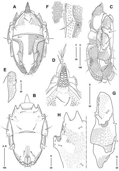 AE (Figure 5B) 112 µm long (101–121 µm, mean = 111 µm, n = 10), 201 µm wide (192–210 µm, mean = 198 µm, n = 10), length to width ratio about 0.56. With three pairs of ventral setae; a pair of epimeral pores situated on 0.33 level of AE, about 6 µm wide opening; medial and lateral epimera I developed, almost same to each other in size; epimera II slightly protruded outward; seven to nine rosette pores running along lateral margins of epimera I and II (Figure 5B,H).