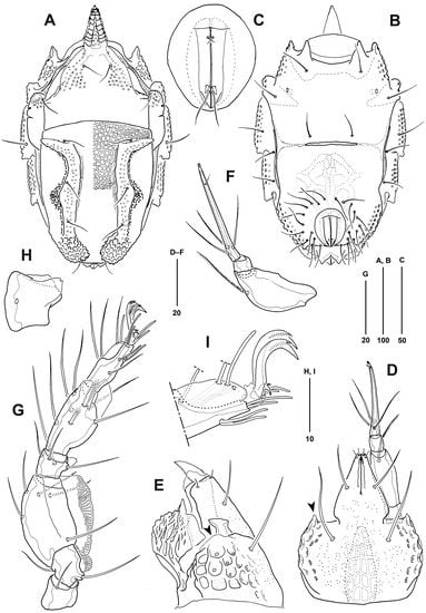 Gnathosoma (Figure 6D,E) 82 μm long (78–86 µm, mean = 82 µm, n = 10), 72 μm wide (64–76 µm, mean = 70 µm, n = 10). Gnathosomal base with pits of canaliculi scattered sparsely on ventral surface, with 15–17 foveae laterally (10–12 of which with rosette pore); lamellae protruding on dorsolateral corner of gnathosomal base (indicated by arrowhead in Figure 6D,E); both protorostral and deutorostral setae minute, issuing from anterior tip of rostrum; basirostral seta located at anterior fourth of gnathosomal base, tritorostral seta at anterior half of rostrum. Rostrum 38 μm long, 0.46 times as long as gnathosoma, reaching to distal margin of P-2. Palp (Figure 6D,F) composed of four segments; P-1 to P-4 12, 33, 8, and 47 μm long, respectively; P-1 and P-3 lacking setae; P-2 with one dorsal bipectinate seta subdistally; P-4 slender and longest, about 1.42 times as long as P-2, with one short distal and three long proximal setae. Tectum (Figure 6E) well-developed crest-shaped process, not reaching rostral tip. Chelicera (Figure 6E) 42 μm long, 11 μm wide; inserted between rostrum and tectum; base quadrangular-shaped, its anterior end reaching to distal end of rostrum; forming movable digit terminally (18 μm long), with row of minute teeth along dorsal margin.