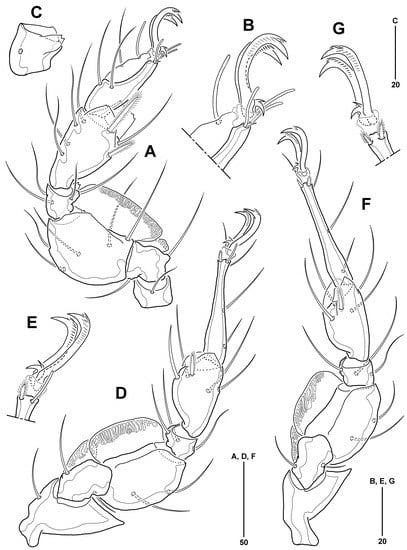 Copidognathus vicinus Bartsch, 1997, female. (A) Leg II, ventromedial; (B) Tip of tarsus II, ventromedial; (C) Ventrolateral lamella on genu II, ventrolateral; (D) Leg III, ventromedial; (E) Tip of tarsus III, ventromedial; (F) Leg IV, ventromedial; (G) Tip of tarsus IV, ventromedial.