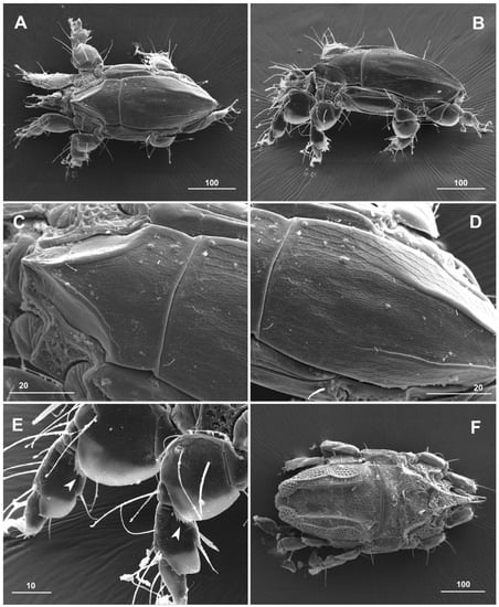 Copidognathus levicostatus n. sp., (A–E), female, SEM photographs: (A) Idiosoma, dorsal; (B) Idiosoma, lateral; (C) AD, dorsal; (D) PD, dorsal; (E) Legs I and II, lateral (arrowheads indicate the teeth on the distal edge of ventrolateral lamellae of genua I and II). Copidognathus vicinus Bartsch, 1997, female, SEM photographs. (F) Idiosoma, dorsal.