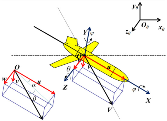 To comprehensively understand the motion of Petrel-L, a kinematic model is established, as shown in Figure 2. The kinematic parameters are crucial to the dead reckoning underwater and thus analyzed in detail. The relationship between the angular velocity and attitude of Petrel-L is described as follows: