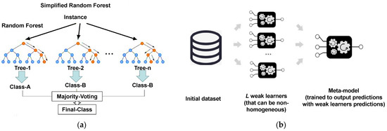 The schematic of machine learning models. (a) The structure of RF [32]. (b) The configuration of Ada-Boost.