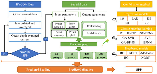 The experimental framework is shown in Figure 5 for a more specific description. The ocean current data imported from HYCOM is processed to meet the requirement first, which, together with the input parameters (preset heading, preset depth, preset buoyancy, preset pitch) of the sea trial data, are taken as the input train data sets. The output parameters (real heading, real distance) are taken as the output train data. Meanwhile, the average running period is about 4–5 h over one profile, so the data sets are divided into 50, 100, 200, and 300 groups corresponding to the time scales of 10, 20, 40, and 60 days. Afterwards, the data are trained by three types of prediction models, and 30 profiles are utilized for evaluation. Then the best methods are selected for distance and heading prediction with different data sizes, and all of them are integrated for a balanced and complete prediction of SPP.