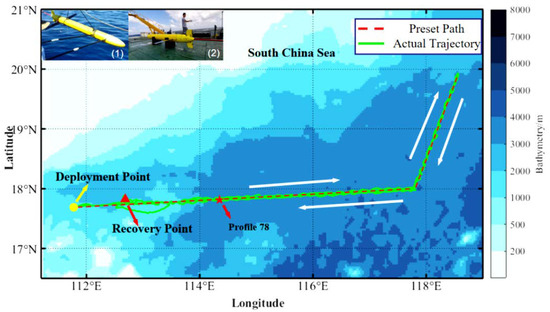 The sea trials were conducted from 27 July 2019 to 23 April 2020. During the experiment, Petrel-L was equipped with a Glider Payload CTD sensor to acquire the salinity and temperature parameters in the interest areas. The deployment and recovery information of the UG is listed in Table 2. The sea trials lasted for 271 days without fault, 1051 profiles were acquired in total, and the total range was 4230.5 km. Here, the biofouling affection for the UG is ignored to simplify the data training process. The uncertainty of glider assembly and GPS are also ignored. Profiles 78–436 are selected as the research data, the initial parameters of the profiles are identical, which could avoid unnecessary influences from other sources. The sea trial areas of Petrel-L (CHC15) in the NSCS are shown in Figure 7, which shows the preset path and actual trajectory. The in-situ deployment and recovery pictures are also displayed by inset (1) and (2), respectively, in the left upper corner.