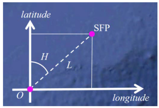 where Olon and Olat are the longitude and latitude of the last SPP, respectively, L is the distance during one profile, and H is the heading of O.