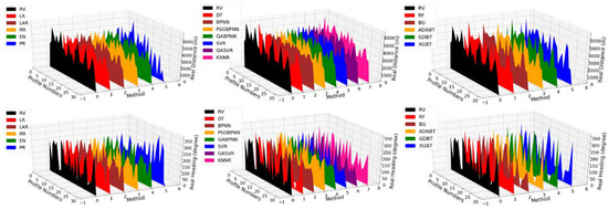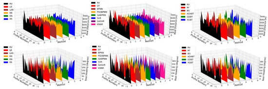 where yi is the real value, is the predicted value, and is the average value of all the real values. The evaluation results of the three models are shown in Figure 14 and Table 5 and Table 6.