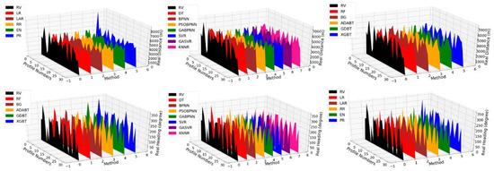 As shown in Figure 10, the predicted distance shows no dramatic change. Because the size of the 50-profile group data is relatively small, the regression model performs a little better than the other two models. Furthermore, for the real heading prediction, the LR, RR, LAR, and EN models take on more stable trends than the others. In Figure 11, when the data size grows to 100, the classical machine learning model shows relatively better performance in the heading prediction. However, there are some abnormal points in both the regression model and the tree-based model. Similarly, abnormal points appear in the regression model and machine learning model for distance prediction, and the tree-based model shows better prediction than them. Furthermore, Figure 12 and Figure 13 reveal that the classical machine learning model and tree-based model have a distinct advantage in predicting either heading or distance when the number of the data groups is over 200.