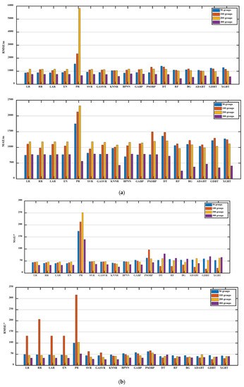 As shown in Figure 14, Table 6 and Table 7, when the number of data groups is 50, the performance of the three models in distance prediction is not ideal. Among the regression models, LR, RR, and LAR perform better, and their MAE and MSE are comparable. EN and LAR perform well in heading prediction, and the MAE, MSE, and correlation coefficient of EN are 40.28 m, 47.05 m, and 0.76, respectively.