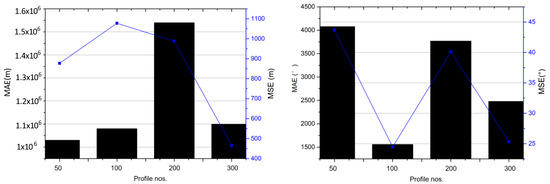 We divided the data into four groups as 50, 100, 200, and 300 profiles after the data analysis and preprocessing. Due to sensor positioning errors and data drift, we preprocessed the original data. Abnormal data were raised and missing data were filled in. Each group corresponds to different time scales. Fifty profiles are roughly equivalent to 10-day data, 100 profiles to 20-day data, and so on. Afterwards, three kinds of prediction models were applied to each group of data for training, and 30 profiles were adopted as the test data. The results are shown in Figure 10, Figure 11, Figure 12 and Figure 13.