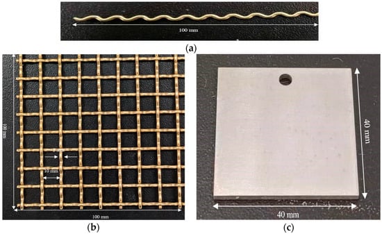 Experimental materials. (a) Copper alloy wire structure. (b) H62 copper alloy mesh. (c) D36 steel plate.