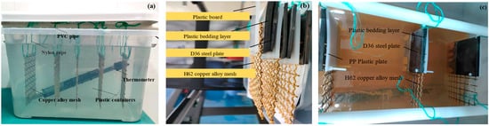 FA2004N Analytical balance (with an accuracy of 0.1 mg) was used to weigh and record the mass of samples before corrosion. The diagram of the H62/D36 galvanic couple with different bedding layers is shown in Figure 4. Different thicknesses of bedding layers (5 mm, 10 mm, 15 mm) were added between the copper mesh and the steel plate. A plastic board was used to fix the lower connection of the steel plate, plastic bedding layer, and copper alloy mesh together. The upper part was fixed with ribbon; finally, nylon rope was inserted above, and galvanic couples were placed in the 3.5% sodium chloride solution in a full-immersed or semi-immersed state. Sodium chloride solution was prepared by deionized water and sodium chloride; the temperature of the solution was 25 °C, and pH was 8.2, adjusted by HCl and NaOH. The semi-immersed test was mainly carried out by marking the samples, with three parallel samples for each working condition. In experiments with different overlapping areas (Figure 5), the plastic bedding layer was removed, and the couple was overlapped according to the projected areas of 28 cm2, 52 cm2, and 100 cm2.