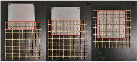 Diagrams of steel plate and copper alloy mesh overlapping. (a) 28 cm2; (b) 52 cm2. (c) 100 cm2.