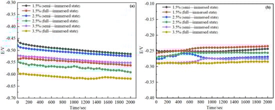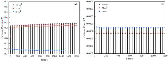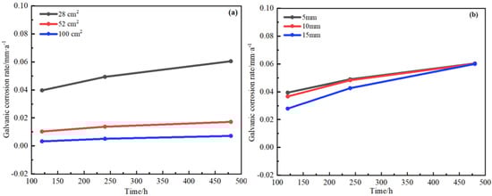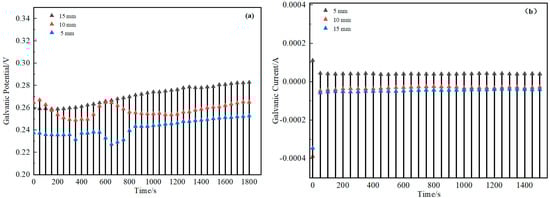 Respectively, Figure 12 and Figure 13 show the changes of galvanic potential and galvanic current with time for H62/D36 coupled with different layer thicknesses and different overlapping areas. From the figures, it could be seen that the galvanic potential increased with the increase of the bedding thickness and increased with the increase of the overlapping area. Meanwhile, the galvanic current was inversely proportional to the bedding thickness and the overlapping area. This indicated that adding the bedding layer or increasing the overlapping area between the copper mesh and the steel plate effectively reduced the corrosion rate, protecting the D36 plate.
