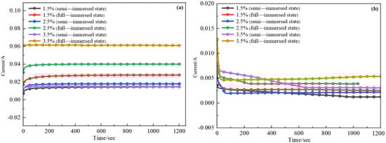 I-t curves of D36 steel and H62 copper alloy shown in Figure 8 showed the variation of current with time. It can be seen from the graphs that the current rose when the NaCl concentration increased, indicating that the NaCl concentration had a drastic effect on corrosion. The stronger the current, the faster the corrosion rate. However, the graphs did not clearly show that the semi-immersed state corrosion rate was greater than the full-immersed state or that the full-submersion state corrosion rate was greater than the semi-immersed state.