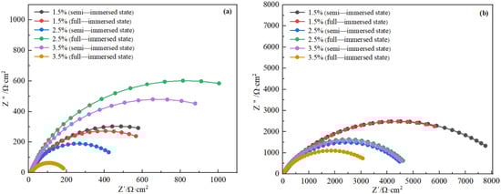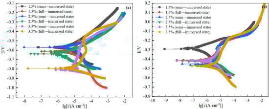 Changes of corrosion rate with time for H62 copper alloy mesh at different NaCl solutions. (a) Semi-immersed state. (b) Full-immersed state.