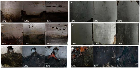 It can be seen from Figure 15 that the macroscopic morphologies of D36 corroded at 120 h, 240 h, and 480 h in different concentrations of NaCl solutions (1.5%, 2.5%, and 3.5%) under semi-immersed/full-immersed state. It can be seen from the figures that there were significant changes at the waterline of D36 steel under the semi-immersed state, and the waterline was more and more obvious with time. The local area of the steel surface appeared to have raised corrosion product accumulated with time, scattered distribution, and difficult to remove with a brush. After the chemical treatment, the particles of the original surface on the steel plate changed into pitting pits of different sizes. D36 steel plates were uniform corrosion under the full-immersed state. In both submersion modes, there were two corrosion product layers. The first layer was the red corrosion product layer, and most of the corrosion product was loose and easy to fall off, precipitating in the corrosion medium. The second black corrosion products layer was removed with a soft brush; the surface with numerous small particles lost its original luster and became rougher with time.