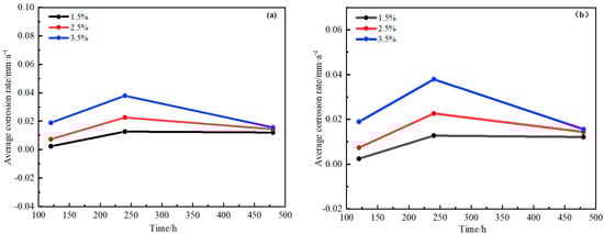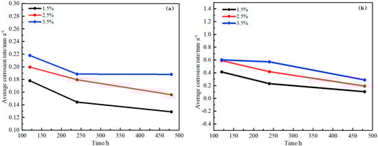 Changes of corrosion rate with time for D36 steel plates in different NaCl solutions. (a) Semi-immersed state. (b) Full-immersed state.