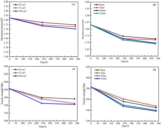 Figure 21a,b show the variations of the maximum force and tensile strength with time for the mesh when there are different bedding thicknesses between copper alloy and steel plate, where the maximum force was applied to the mesh when the bedding thickness was 0 mm. The reason was that the steel plate potential was lower and the copper alloy potential was higher, so the steel plate appeared as the anode in seawater when coupled with copper alloy mesh, which avoided further corrosion of the copper alloy to some extent, and the mesh could maintain a larger force. As the thickness of the bedding layer increased, the distance between the mesh and the steel plate increased, the anodic protection effect decreased, the corrosion rate of the steel plate decreased, and the corrosion rate of the mesh increased compared with the corrosion rate when it was directly lapped with the steel plate, so the force was gradually weakened when exposed in seawater. However, it could also be found that the bedding layer thickness was selected uniformly, the range was not large, and the results illustrated that force changes of the mesh due to the three bedding layer thicknesses were flat. The maximum force on the mesh gradually decreased with the extension of time, and all of them were lower than the maximum force of the mesh before corrosion. This showed that even though the mesh was directly lapped with the steel plate and the mesh was protected by the steel plate as the cathodic material, it still suffered some corrosion in the simulated seawater, which affected the force changes.