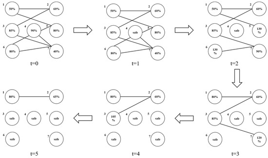 The evolution process of “successive safety” of the causal network model of ship collision proposed in this paper is shown in Figure 1. The number in the circle in Figure 1 indicates the protection rate of the node, i.e., protection rate = protection value of the node/safety threshold of the node × 100%. When the protection rate reaches 100%, the node is in a safe state, and the node will not cause an accident. When the protection rate exceeds 100%, the node maintains a safe state while assigning the additional protection value above the safety threshold to its neighboring nodes. For example, when = 0, the protection rate of each node in the network does not reach 100%; at this time, each node is in a dangerous state, and these nodes may cause an accident at any time. When = 1, additional protection measures are applied to node 4, so that the protection value of node 4 exceeds its safety threshold. At this point, the protection rate of node 4 exceeds 100%, so node 4 has additional protection values to assign to its neighboring nodes (such as node 5 and node 6). At = 2, the protection values of node 5 and node 6 are updated as node 5 and node 6 receive additional protection values, and the protection rates of both node 5 and node 6 exceed 100% after the update. At this time, node 5 and node 6 have additional protection values to assign to their neighboring nodes (e.g., node 1 and node 7). At t = 3, after node 1 and node 7 receive additional protection values, their respective protection values are updated, and the protection rate of node 7 exceeds 100% after the update. At this point, node 7 has additional protection values to distribute to its neighboring nodes (e.g., node 3). At = 4, node 3 receives the additional load, and its protection rate exceeds 100%. At this point, node 3 allocates the additional protection value to node 2. At = 5, the “successive safety process” in the network ends because no new node has a protection rate exceeding 100%.