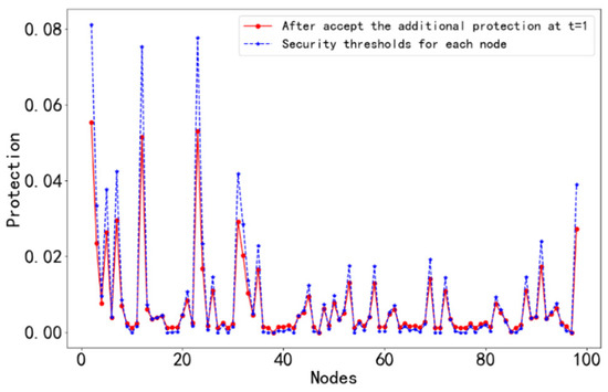 t = 0: As the initial protection value of node 1 does not reach the safety threshold, node 1 is assigned an additional protection value equal to three times its own protection value to make it in a fully secure state. At this point, the protection value of node 1 is greater than its own safety threshold, and the successive safety evolution starts.