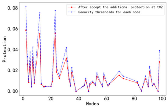 t = 2: Repeating the above successive safety evolution process, the protection value of neighboring nodes at the moment t = 2 is compared with its own safety threshold, as shown in Figure 6.