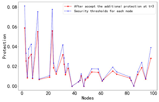 t = 3: Similarly, the above successive safety evolution process is repeated to obtain a comparison of the safety threshold of the neighboring node protection with its own at the moment t = 3, as shown in Figure 7.