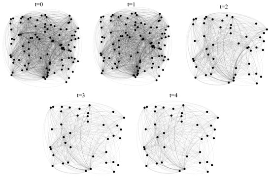 As can be seen from Figure 9, the network gradually becomes sparse after each evolutionary step. This means that the successive safety processes triggered by node 1 have more causative nodes entering a secure state. The reduction in the causative nodes in the network can directly indicate that the protection of node 1 can reduce the probability of accidents.