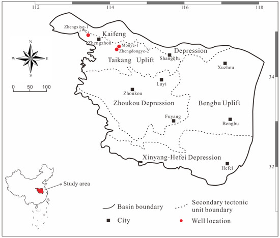 Located south of the North China Block and its southern margin (Figure 1), the SNCB is mainly controlled by the structure of the Qinling–Dabian orogenic belt [29]. From the distribution characteristics of the Mesozoic and Cenozoic in the basin, the SNCB is divided from north to south into five structural units: the Kaifeng Depression, the Taikang Uplift, the Zhoukou Depression, the Bengbu Uplift, and the Xinyang Hefei Depression (Figure 1) [29,30,31].
