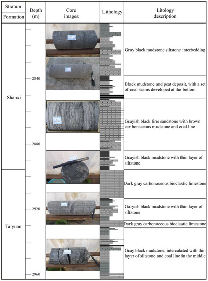 The Mouye-1 (MY1) well, drilled in 2014, was the first shale gas exploration well in the SNCB, and shale gas was found in the Upper Paleozoic strata. The Weican-1 well, drilled in the same year, encountered OM-rich shale with a cumulative thickness of 465 m in the Shihezi, TYF, SXF, and Benxi Formations. The Zhengxiye-1 (ZXY1) well, drilled in 2015, also saw good shale gas in the Permian SXF and TYF [34,35]. As of July 2020, the MY1, Zhengdongye-2 (ZDY2), and ZXY1 wells had been drilled northwest of the SNCB to explore for shale gas (Figure 1) [35]. The shale thicknesses in the TYF of the MY1, ZDY2, and ZXY1 wells are 54 m, 31 m, and 12 m, respectively, and the thicknesses of the SXF are 44 m, 14 m, and 16 m, respectively. From the cores, it is apparent that the lithology of the TYF is mainly grayish black mudstone, dark gray limestone, grayish black sandstone, dark gray sandstone, and dark gray shale, with thin layers of siltstone, coal lines, and barrier coastal facies. The lithology of the SXF is dominated by grayish black mudstone, carbonaceous mudstone, silty mudstone, fine sandstone, and sandstone, which are delta facies (Figure 2).