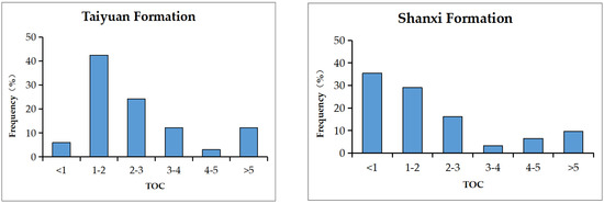 The TOC content of the TYF shale was 0.92–7.43 wt.%, with an average of 2.48 wt.% and a median of 2.24 wt.%. The TOC of coal was 54.45–66.55 wt.%, with an average of 60.5 wt.%. Approximately 51.52 wt.% of the samples were >2 wt.%, which indicates a good source rock [4] (Table 1; Figure 3). The TOC of the SXF shale was 0.36–5.1 wt.%, with an average of 1.68 wt.% and a median of 1.73 wt.%, and the TOC of coal was 58.95–61.29 wt.% (average of 60.5 wt.%), of which approximately 35.48 wt.% of the samples were greater than 2 wt.% (Table 1; Figure 3). Overall, the TOC content of the Lower Permian shale in the SNCB is relatively high, with the TOC content of the shale in the TYF being higher than that in the SXF.
