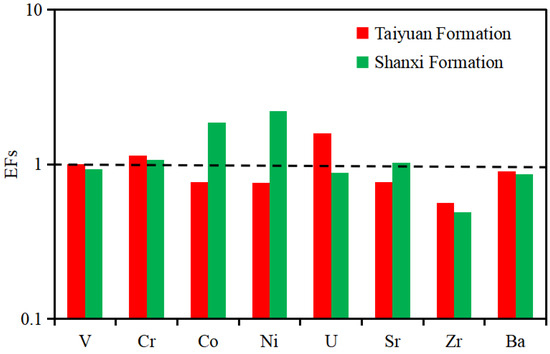 EF diagram of selected TEs for the TYF and SXF shales. The horizontal line (EF = 1) separates the enrichment (above the line) or depletion (below the line) of an element.