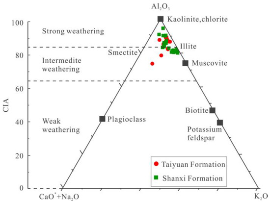Ternary diagram of molecular proportions Al2O3 − (CaO* + Na2O) − K2O. The left side shows the CIA scale. The TYF and SXF shale samples display intermediate to strong weathering [20,40].