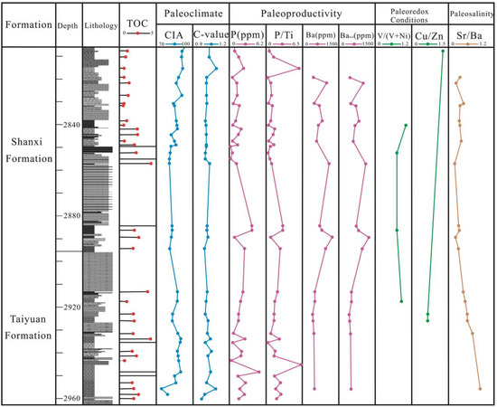 Stratigraphic distributions of TOC, paleoclimate indicators (CIA and C-value), paleoproductivity-related proxies (P, P/Ti, Ba, and Babio), paleoredox indicators (V/(V + Ni) and Cu/Zn), sedimentation rate ((La/Yb)N), and paleosalinity indicators (Sr/Ba) in the core of the ZXY1 well.