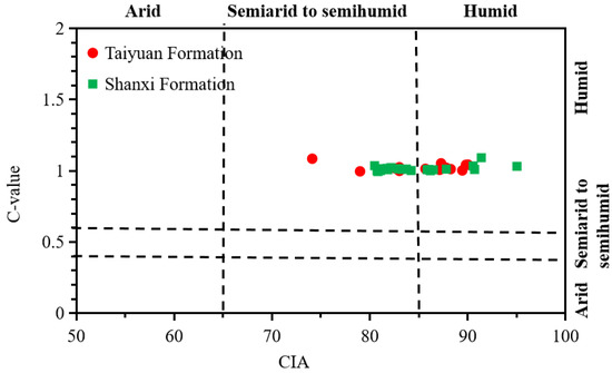 When the C-value < 0.4, it indicates a cold and arid climate; when the C-value range is 0.4–0.6, it indicates a semi-humid semi-arid climate; and when the C-value > 0.6, it indicates a warm and humid climate [21,22]. In this study, the C-value of the TYF shale samples ranged from 0.91 to 1.08, with an average of 1.01; the C-value of the SXF shale samples ranged from 0.99 to 1.09, with an average of 1.01 (Table 4). Based on the C-value results, the TYF and SXF were deposited in a warm and humid paleoclimate, which was conducive to the accumulation of OM (Figure 8, Figure 9 and Figure 10).