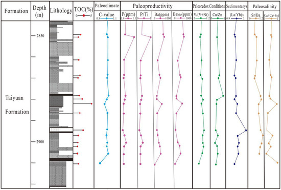 OM enrichment is usually affected by many factors, such as primary productivity, redox, paleosalinity, and sedimentation rate, which are complex physical and chemical processes [9,16,18,65]. According to the paleosedimentary environmental indicators, the paleoclimate conditions of the TYF and SXF in the SNCB were similar, both of which were deposited in a warm and humid environment, with relatively high biological productivity and sedimentation rates. Furthermore, the paleosalinity of the TYF and SXF was low during the deposition period, with the environment dominated by a dysoxic–anoxic set of circumstances belonging to marine-continental transitional and continental facies.