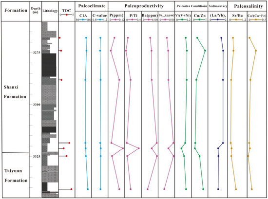 Stratigraphic distributions of TOC, paleoclimate indicators (CIA and C-value), paleoproductivity-related proxies (P, P/Ti, Ba, and Babio), paleoredox indexes (V/(V + Ni) and Cu/Zn), and paleosalinity (Sr/Ba and Ca/(Ca + Fe)) in the core of the MY1 well.