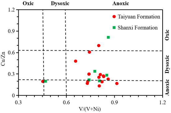 TEs, such as the metallic elements U, Th, V, Cr, Ni, Cu, and Zn, are sensitive to the redox environment of water bodies because their solubility is controlled by the redox state of water bodies [19]. U, V, Cr, Ni, Cu, Zn, and other elements are easily soluble in water when the water body provides an oxidizing environment, but they are not soluble in water under reducing conditions [2]. When the water body is an oxygen-poor environment, it is enriched in sediments and almost does not migrate. This provides an indication of ancient water environment and can be used to judge the oxidation–reduction environment of its water body [2,19]. In this study, V/(V + Ni) and Cu/Zn were used to determine the redox conditions of the sedimentary environment.