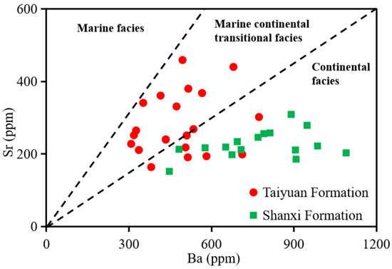 The Sr/Ba ratio is an important index for judging the salinity of ancient water. Sr is more soluble in water than Ba, meaning Sr migrates further into water, and the Sr/Ba ratio can indirectly reflect continental and marine sediments [60,61,62,63,64]. A Sr/Ba value less than 0.5 indicates a freshwater environment; a value of 0.5–1.0 indicates a brackish water environment; and a value greater than 1.0 suggests a saline water environment [43]. The Sr/Ba value of the TYF samples ranged from 0.21 to 5.31, with an average of 0.78 (Table 4), indicating a freshwater–brackish water environment; the Sr/Ba value of the SXF samples ranged from 0.18 to 0.44, with an average of 0.29 (Table 4), indicating a freshwater environment, implying that the TYF belonged to marine-continental transitional facies while the SXF was continental (Figure 8, Figure 10 and Figure 13).