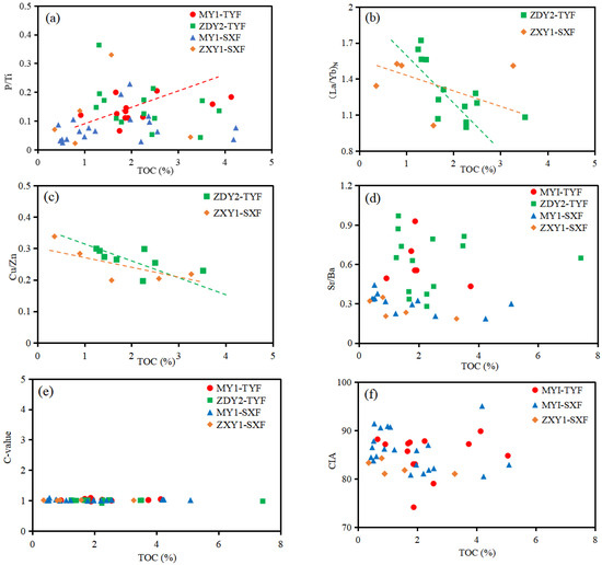 Correlations between TOC contents and productivity index (P/Ti), sedimentation rate index (La/Yb)N, redox index (Cu/Zn), paleosalinity (Sr/Ba), and paleoclimate (C-value, CIA): (a) TOC vs. P/Ti; (b) TOC vs. (La/Yb)N; (c) TOC vs. Cu/Zn; (d) TOC vs. Sr/Ba; (e) TOC vs. C-value; and (f) TOC vs. CIA.