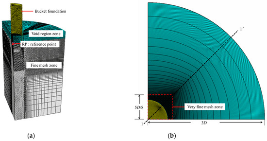 For concrete bucket foundation, the common sizes of D typically range from 5 to 25 m, with t falling within the range of 0.2 to 0.6 m. Therefore, the outer diameter of the outer bucket (D) is set as 10 m, while the diameter of the inner bucket (Din) in the base is equal to D/2. A typical value of t = 0.4 m is used for all the skirt thickness. In order to avoid the influence of soil boundary effect on the penetration process, the radius of the soil domain is set to 3D and the soil depth is set to 5D. The height of the Eulerian mesh needs to exceed the original top boundary of the soil to avoid the loss of the material. A 5 m void layer was set above the soil field to allow sufficient flow space of the surface soil. In order to maintain the accuracy of the calculation of the penetration resistance and soil heaving in the bucket, a very fine mesh zone shaped in a square column with width of 1.25D was set surrounding the bucket foundation. The minimum mesh size was set as t/6, as shown in Figure 2, which is consistent with the setting in Xiao et al. (2019) [7]. Due to the symmetry, and in order to improve the computational efficiency, only a quarter of the domain was selected for the simulation, as shown in Figure 2. The soil base was fixed while only vertical displacements were allowed for side boundaries.